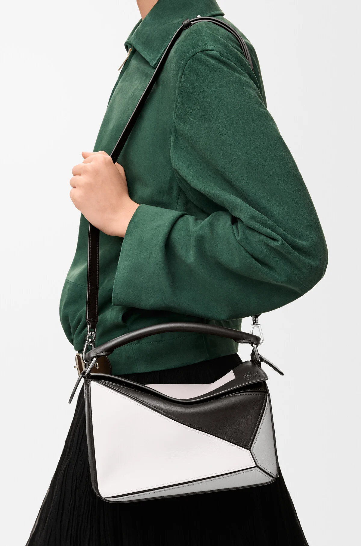 퍼즐은 독특한 기하학적 라인과 큐브 형태가 특징입니다. 스몰 버전은 요제프 알베르스(Josef Albers)의 '정사각형에 바치는 경의(Homage to the Square)' 시리즈에서 영감을 받아 인타르시오 스퀘어 모티브를 장식한 나파 카프스킨 소재로 제작되었습니다. 이 백은 로에베 x Josef & Anni Albers(요제프 & 안니 알베르스) 컬렉션의 일부입니다.