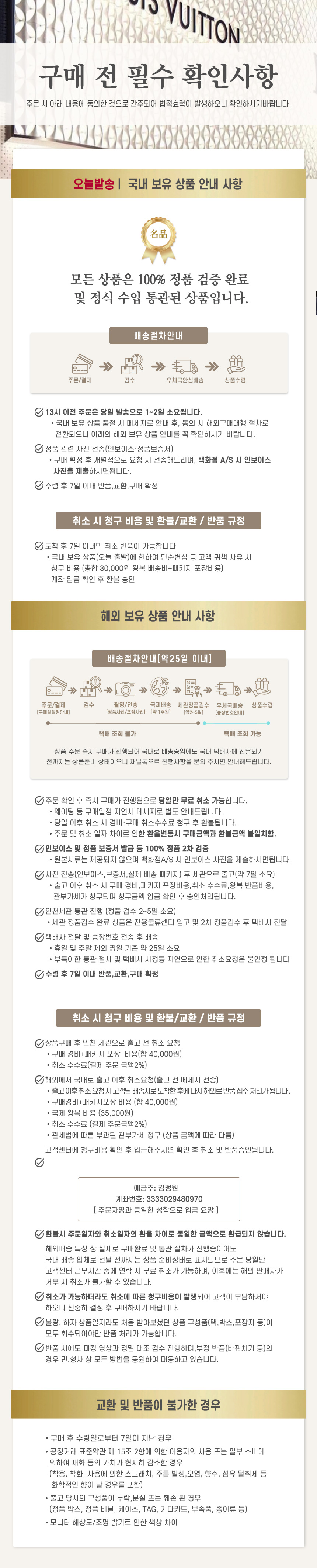 - 교환 및 반품 비용은 계좌로 이체 후 고객센터에 문자로 이체자명과 주문 상품명을 남겨주시기바랍니다.